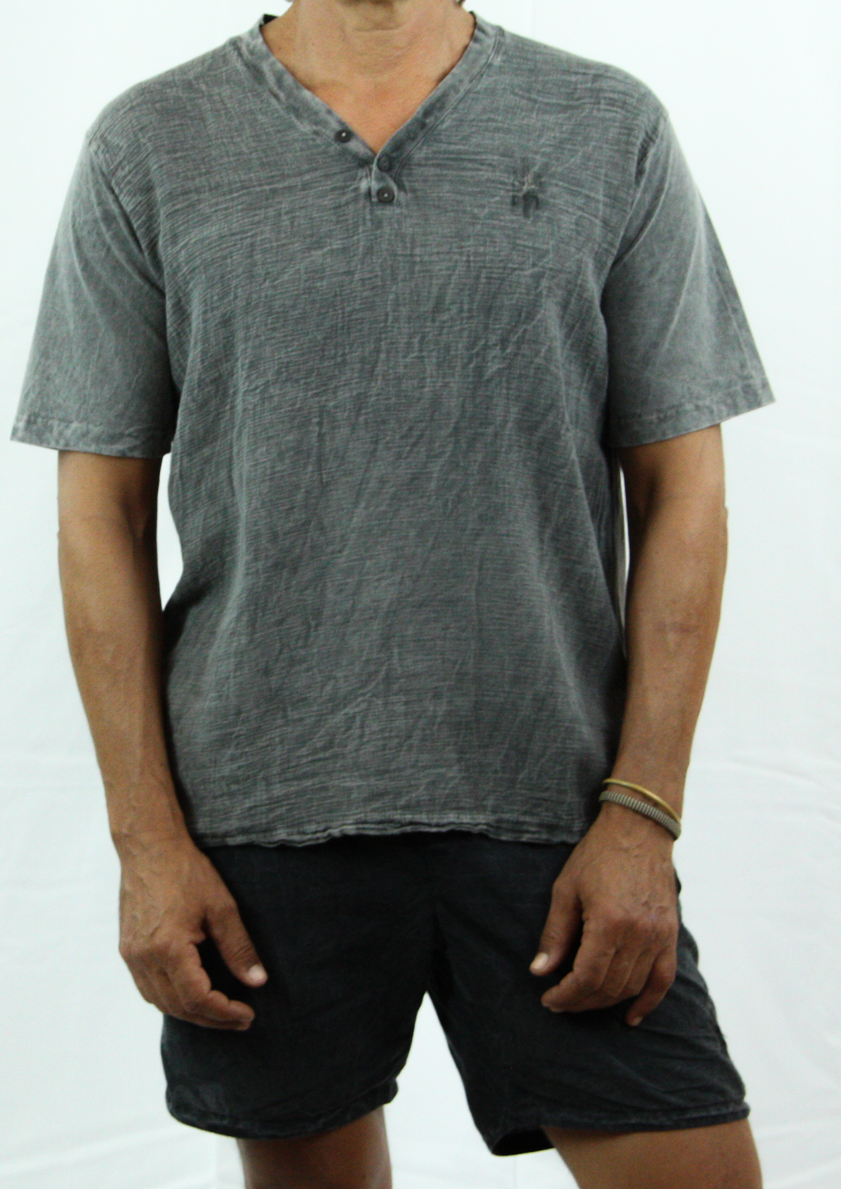 CAMISETA MANGA CORTA CUELLO PICO CON BOTONES DECORATIVOS. PARTE FRONTAL EN TEJIDO GASA. PARTE TRASERA EN PUNTO LISO. 100% ALGOD脫N ORG脕NICO.